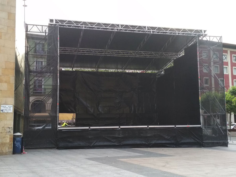 El escenario cubierto NOVO está ideado para eventos que requieran poca carga en la cubierta y que necesiten un producto de 1ª calidad con un precio muy ajustado. En cualquiera de sus medidas estandar, la cubierta de truss de 40x40cm y lona ignífuga se apoya sobre estructura Allround de Layher; contando además con cámara negra, barandillas, escalera y rampa.El montaje es muy rápido y sencillo, no se necesitan grandes grúas y con poco personal se termina en el mismo día.