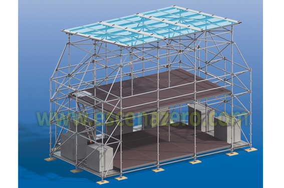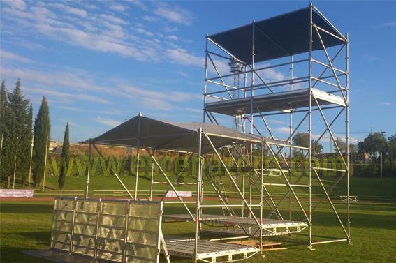 Así mismo, las torres se pueden instalar con plataformas de diferentes tipos, escaleras interiores y/o exteriores, barandillas dobles o simples, etc. Por supuesto, a diferentes niveles y alturas, y con posibilidad de cubirlas para evitar afecciones metereológicas. Incluso se pueden montar sencillos y acogedores sets de televisión, camerinos provisionales, zonas de esparcimiento, entrevistas, etc. Pudiendo cerrar todos los lados del mixer para limitar la vista y/o el acceso.