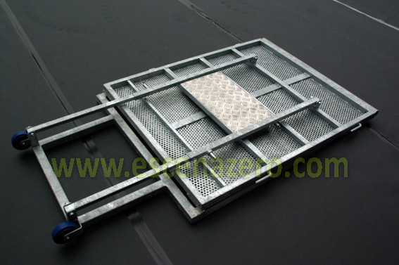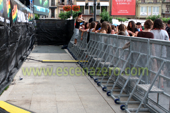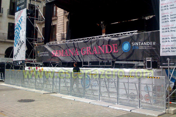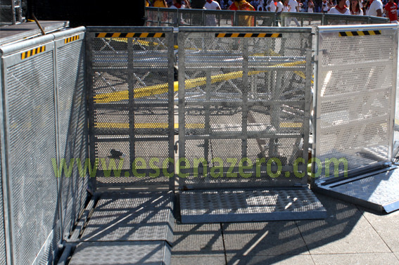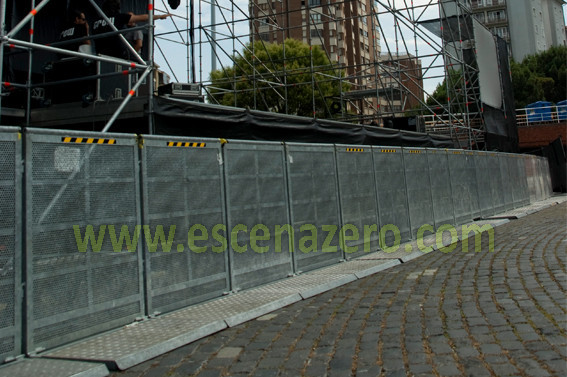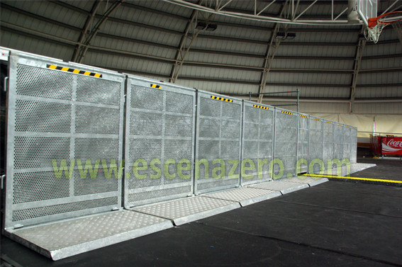 De acero galvanizado y aluminio, sus medidas son 1m de ancho y 1,30m de alto, provistas de peldaño interior y con plancha frontal perforada para permitir el paso del sonido. La base está diseñada para evitar tropiezos y resbalones del público, la unión de estas vallas se realiza fácilmente, consiguiendo una la estabilidad y resistencia total.